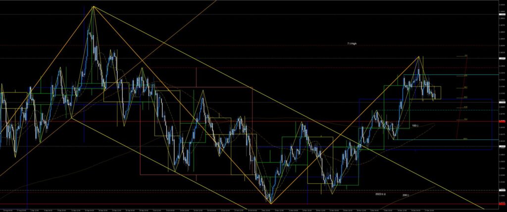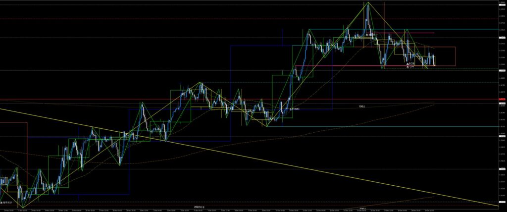火曜高値下降波の戻り売りと先週安値上昇波の押し目買いの思惑が交錯し水曜安値と先週高値のレンジ相場。