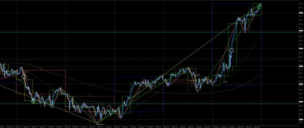 米国の雇用統計や消費者物価指数、日銀金融政策決定会合など経済イベントが目白押しでしたが、基本は上目線で、155円のサポート、もしくは2週前安値2番底からの上昇を狙っていました。