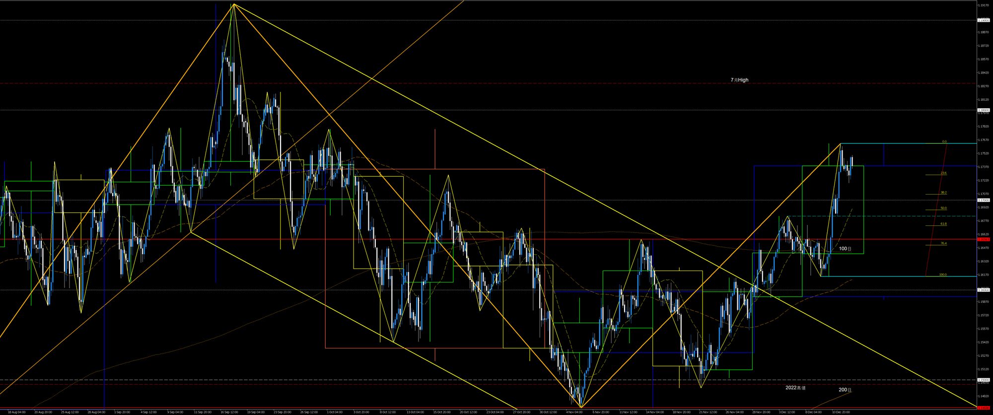 火曜高値下降波の戻り売りと先週安値上昇波の押し目買いの思惑が交錯し水曜安値と先週高値のレンジ相場。