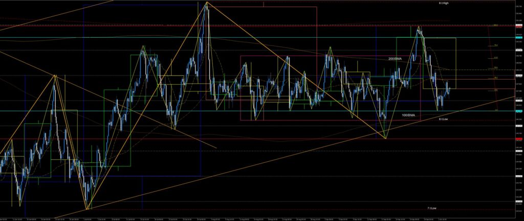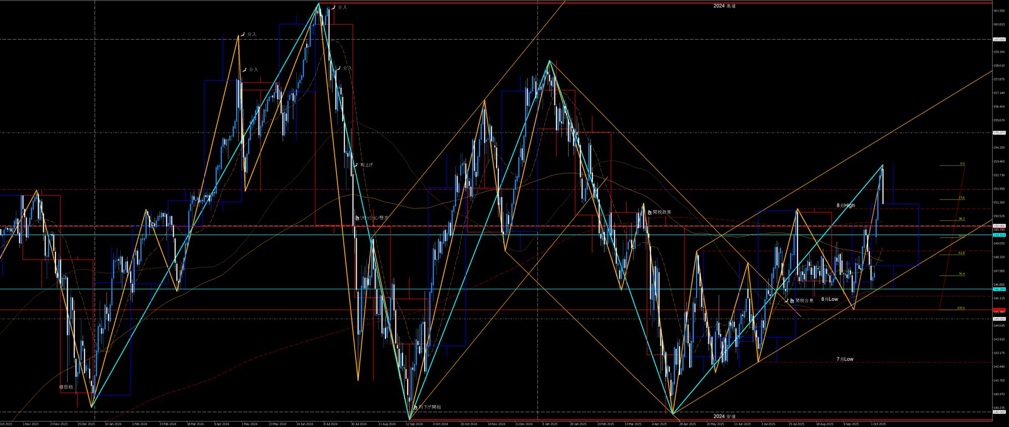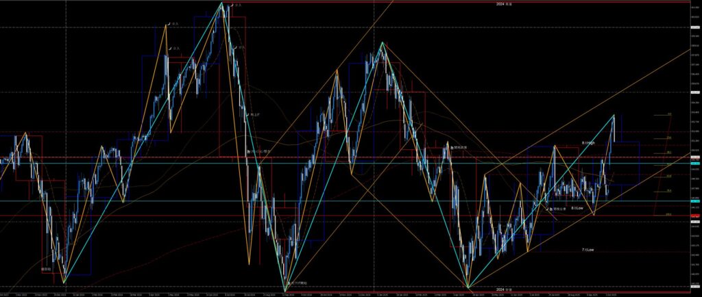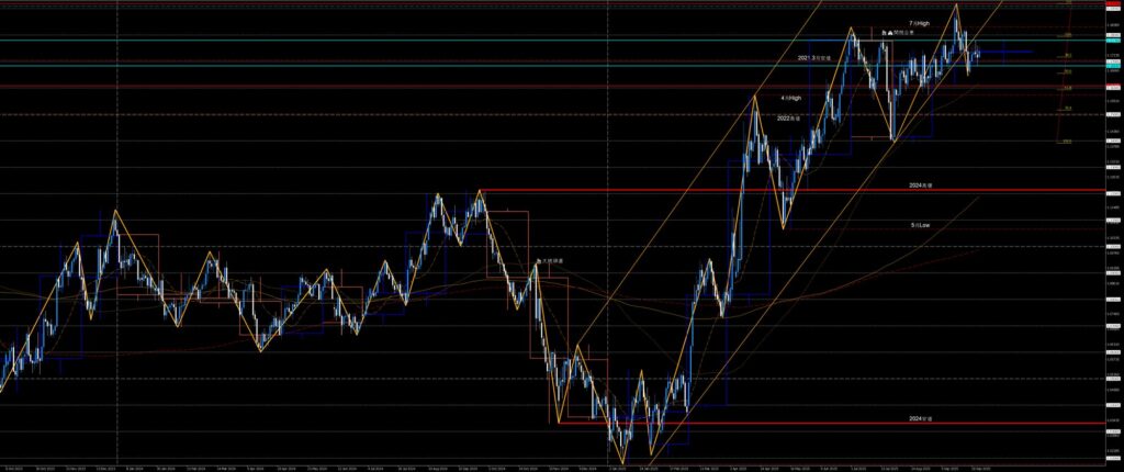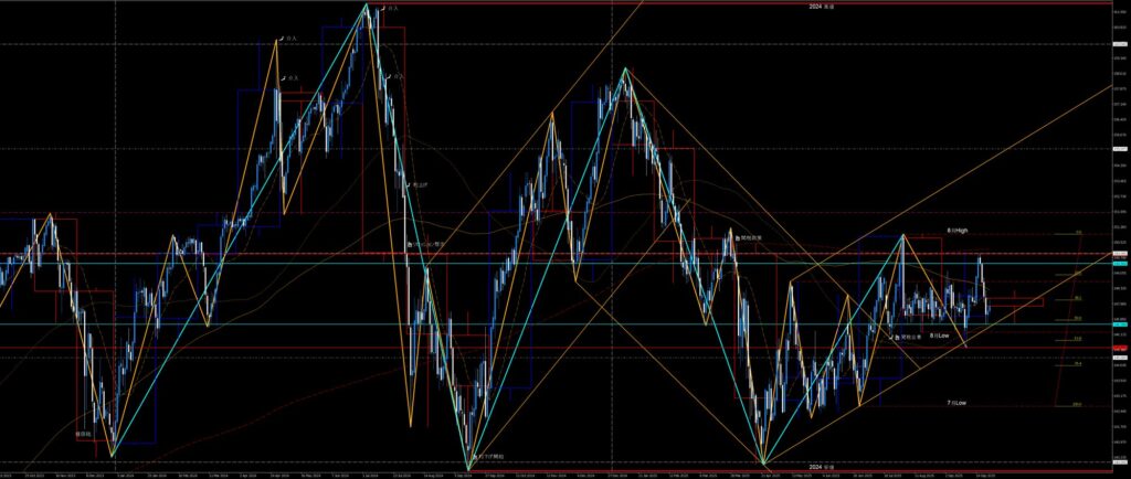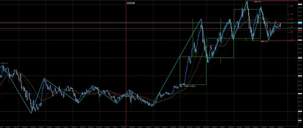 - 節目150円を挟んで2024高値Wトップ2番天井と2024安値Wボトム2番底との睨み合い
