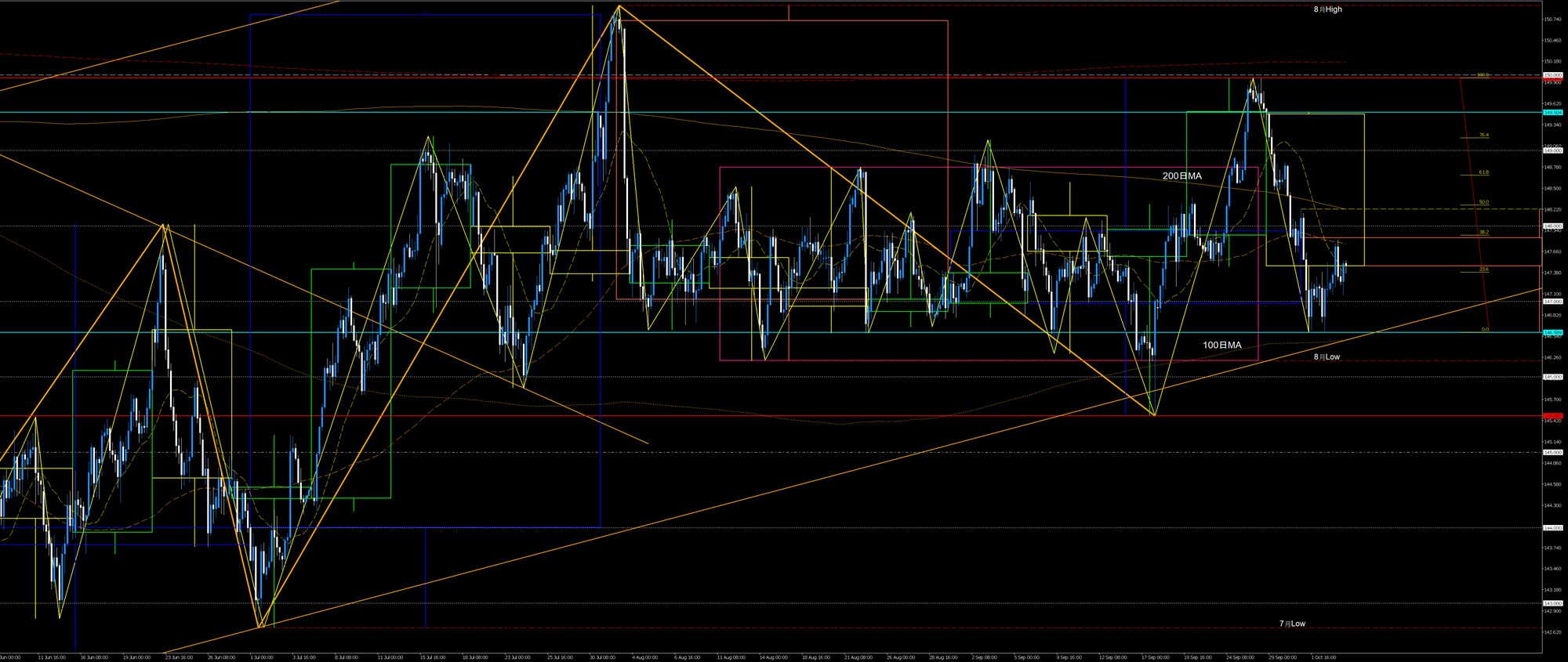 東京時間、2番底崩れでショート、欧州時間に9月安値到達で半分決済、翌日の東京時間に1hSMA21のレジサポ転換で撤退。