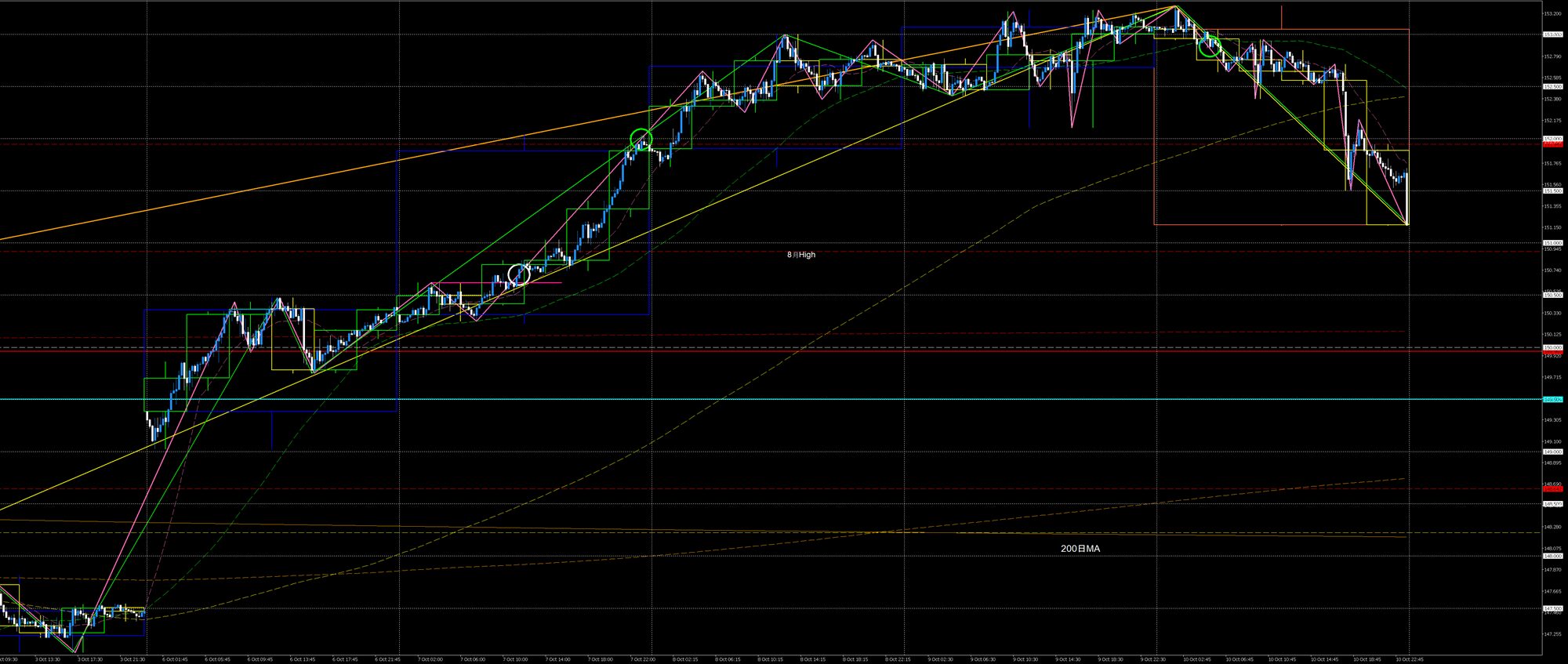 東京時間、前日高値で小動き。欧州時間、前日高値+東京時間高値を上抜けたところでロング、明け方に152円到達で半分OCO決済、金曜の東京時間に15分足Wトップネック割れで決済。