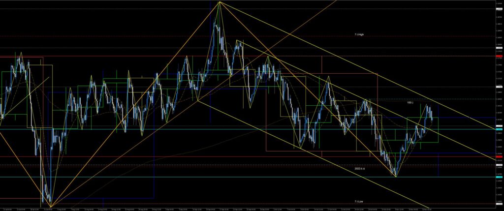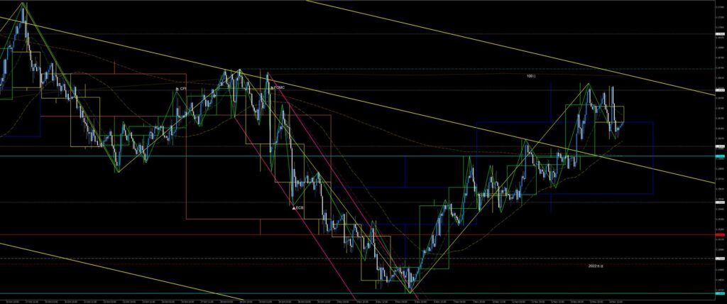 週明けから水曜に掛けて日足SMA21と4h足SMA21に挟まれ、2週前高値下降波の戻り売りと先週安値上昇波との売り買いの攻防で保合いました。