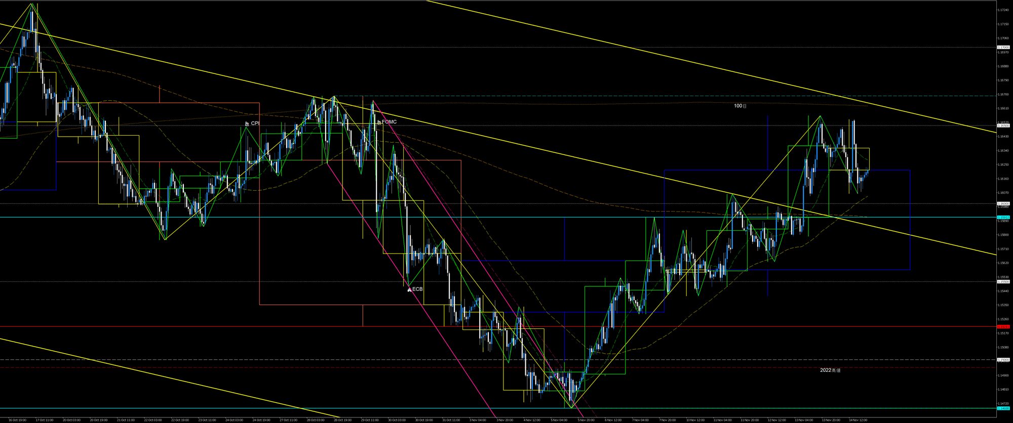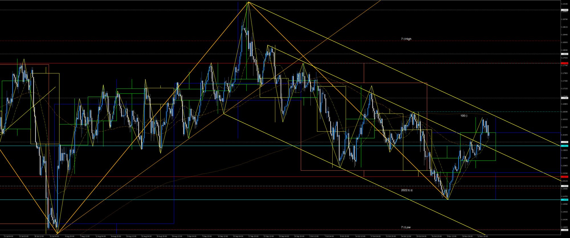 木曜に1.16の戻り目が崩れたことで2週前高値下降波の戻り売りを狙うショート組の決済を巻き込んで上昇。2週前高値下降波を全窓視しました。