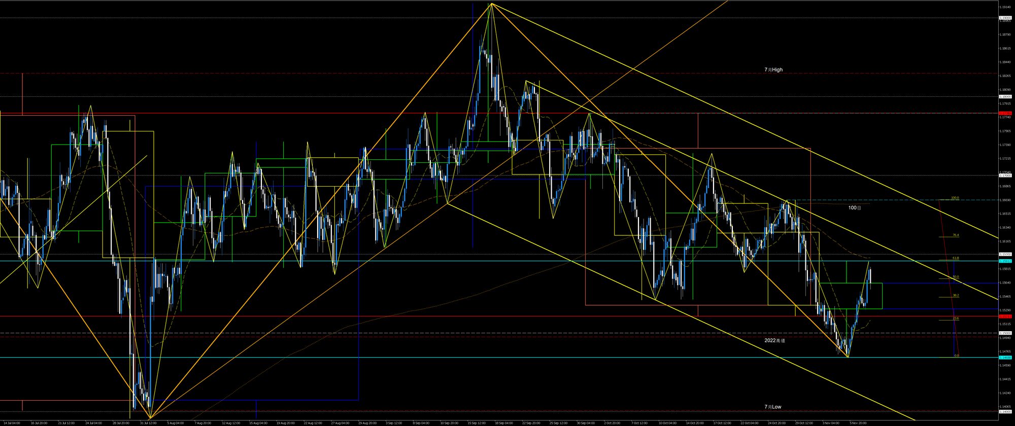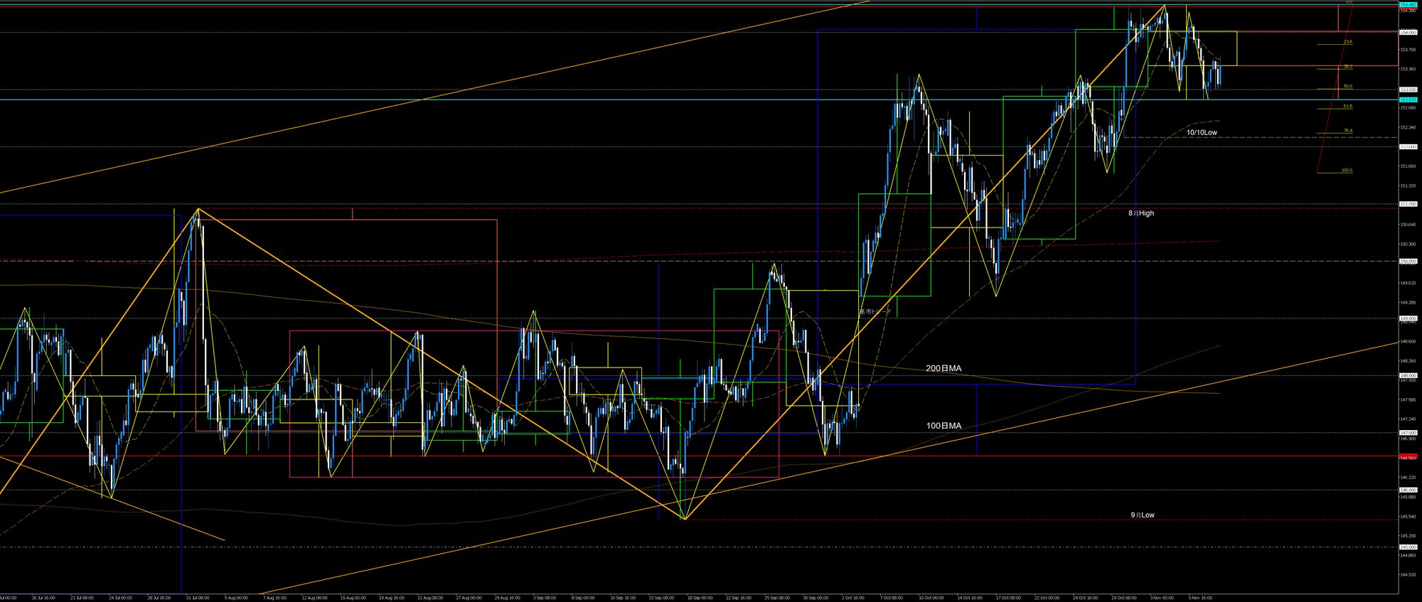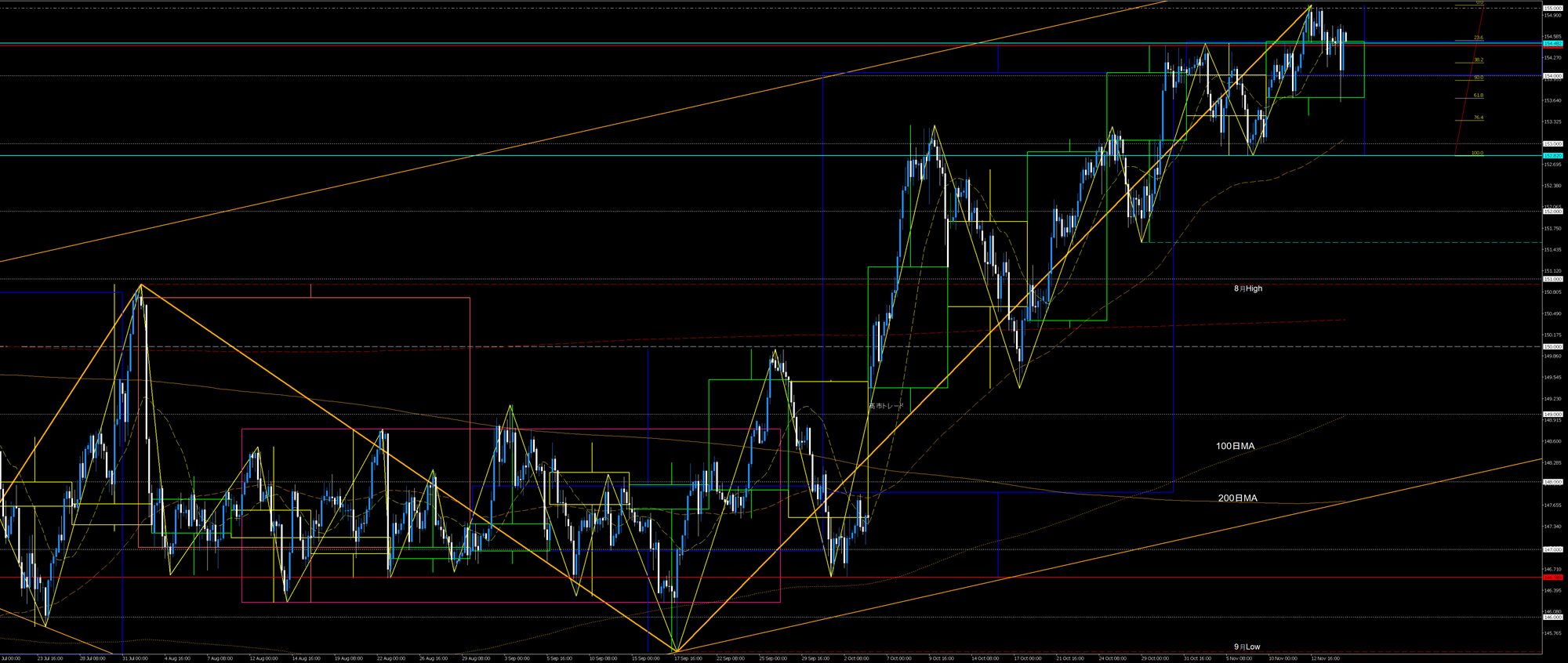 9月安値発の4h足上昇トレンドは先週時点で押し目買いが複数回繰り返されており、回を追う毎に上昇の値幅が小さくなっています。そして2週前の中銀ウィークでの上昇波は節目155円に届かず、先週には上値の重い値動きとなっていました。このような要素から9月安値上昇波はクライマックスの段階とみることができます。火曜安値上昇波は9月安値上昇波の断末魔なのかもしれません。専門的にはバイイング・クライマックスと考えられます。