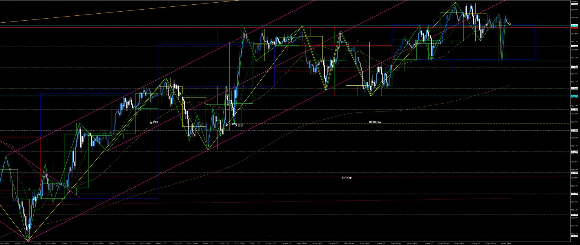 買うには節目155円と先週高値Wトップが意識され上値が重くなりやすく、売るには153円+日足SMA21+10/10安値のサポート帯があり下値に余裕がないためトレードするには難易度が高いと判断しました。