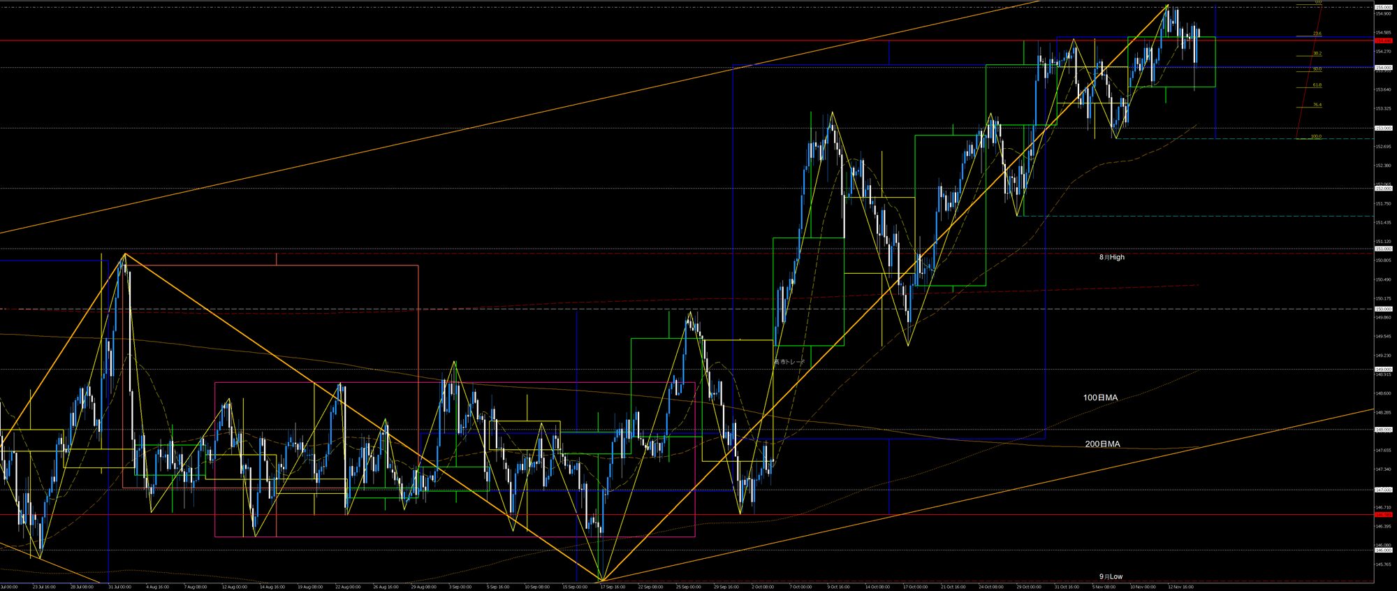 今週の主な値動きは、4h足上昇トレンドの先週安値押し目買いが155円を試す値動きでした。