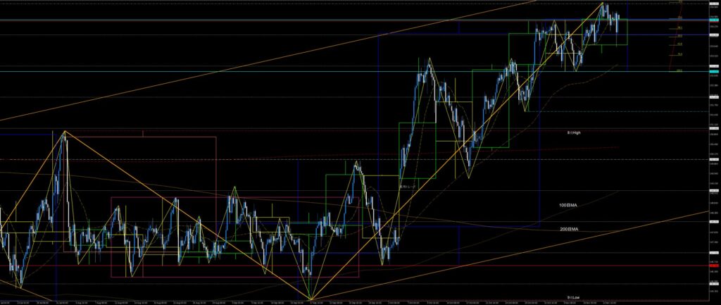 日足SMA21に沿って9月安値上昇トレンドが継続する中、節目155円が意識され上値の重い値動き。9月安値上昇波のクライマックス感。