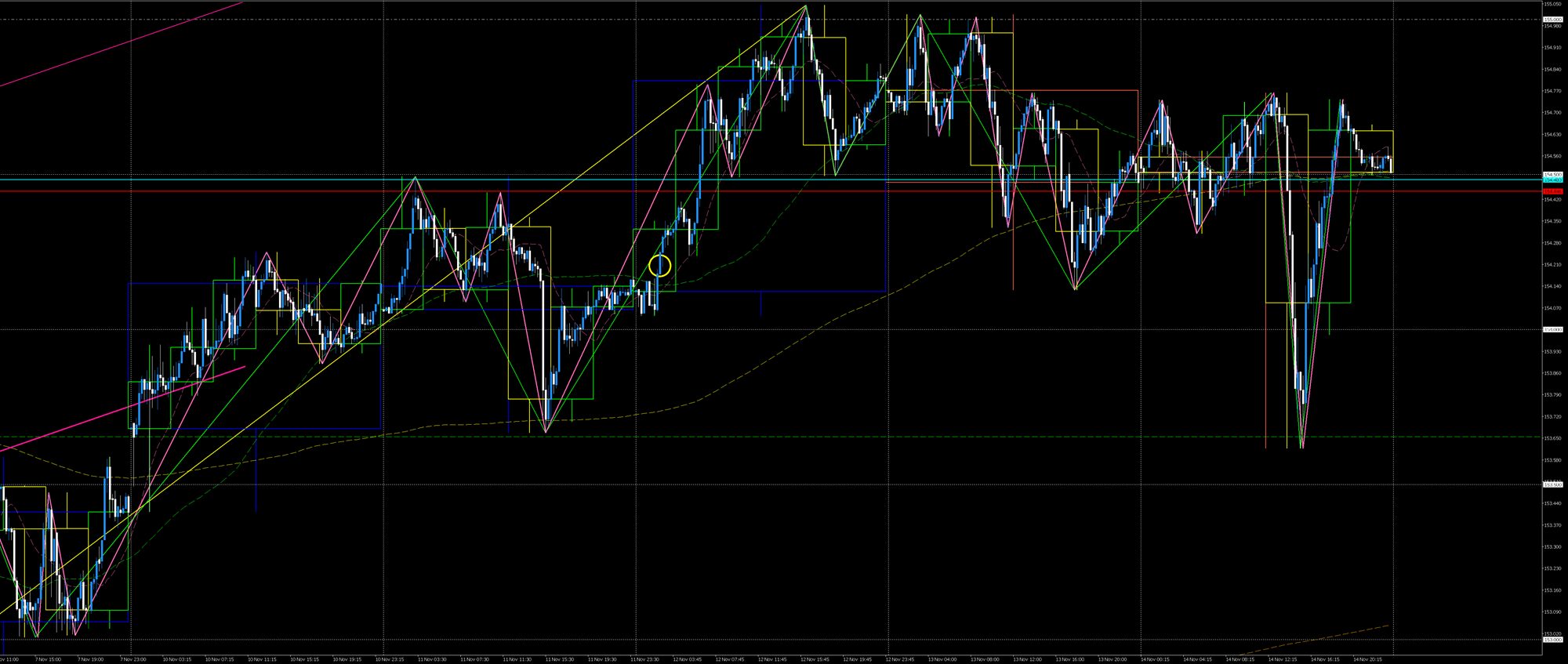 東京時間、先週高値のレジスタンスを警戒し黄色〇ロングは見送り。欧州・NY時間、155円に到達し反落。