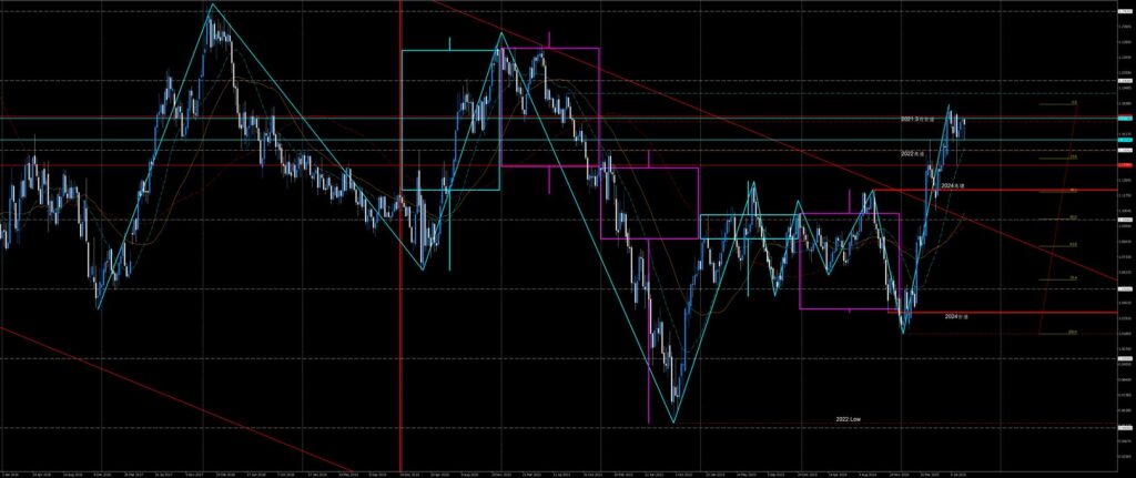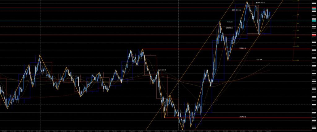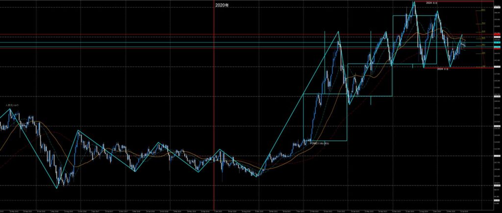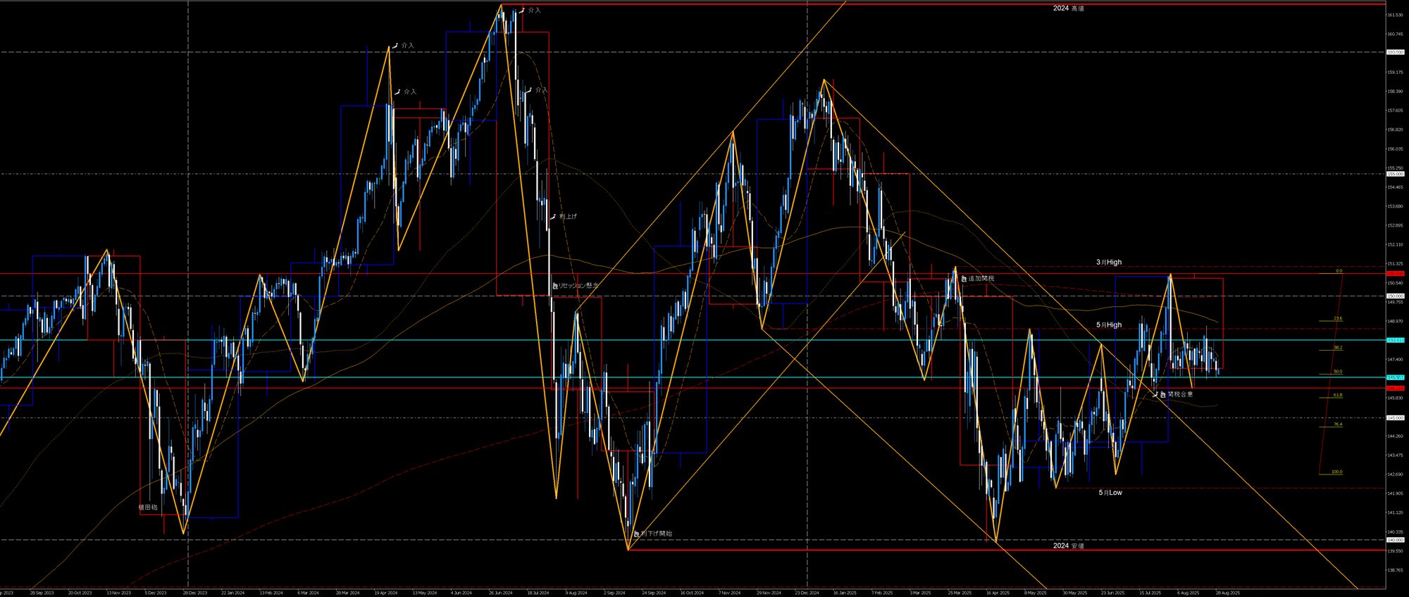 - 2025安値上昇波が2022高安のハラミを上抜けて2021Wトップネックラインに到達