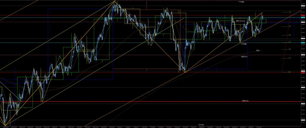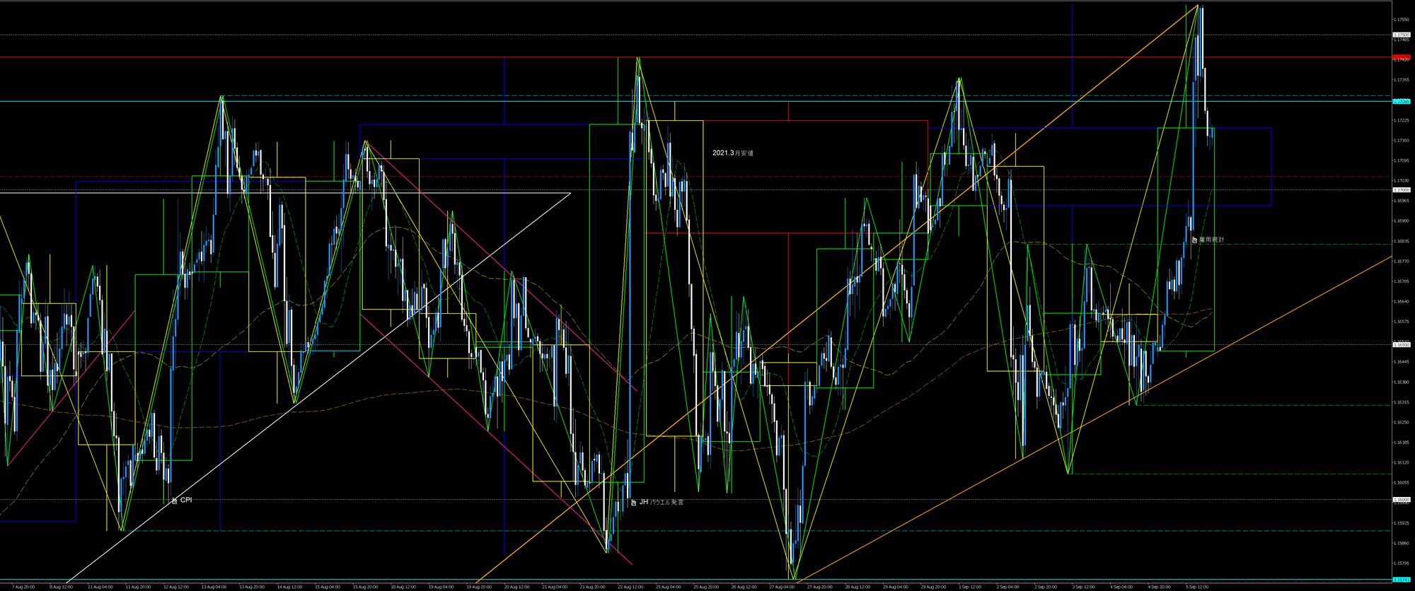 - 日足上昇トレンド8月安値押し目買いが進行する中、日足2番天井が意識され1.17付近で膠着状態