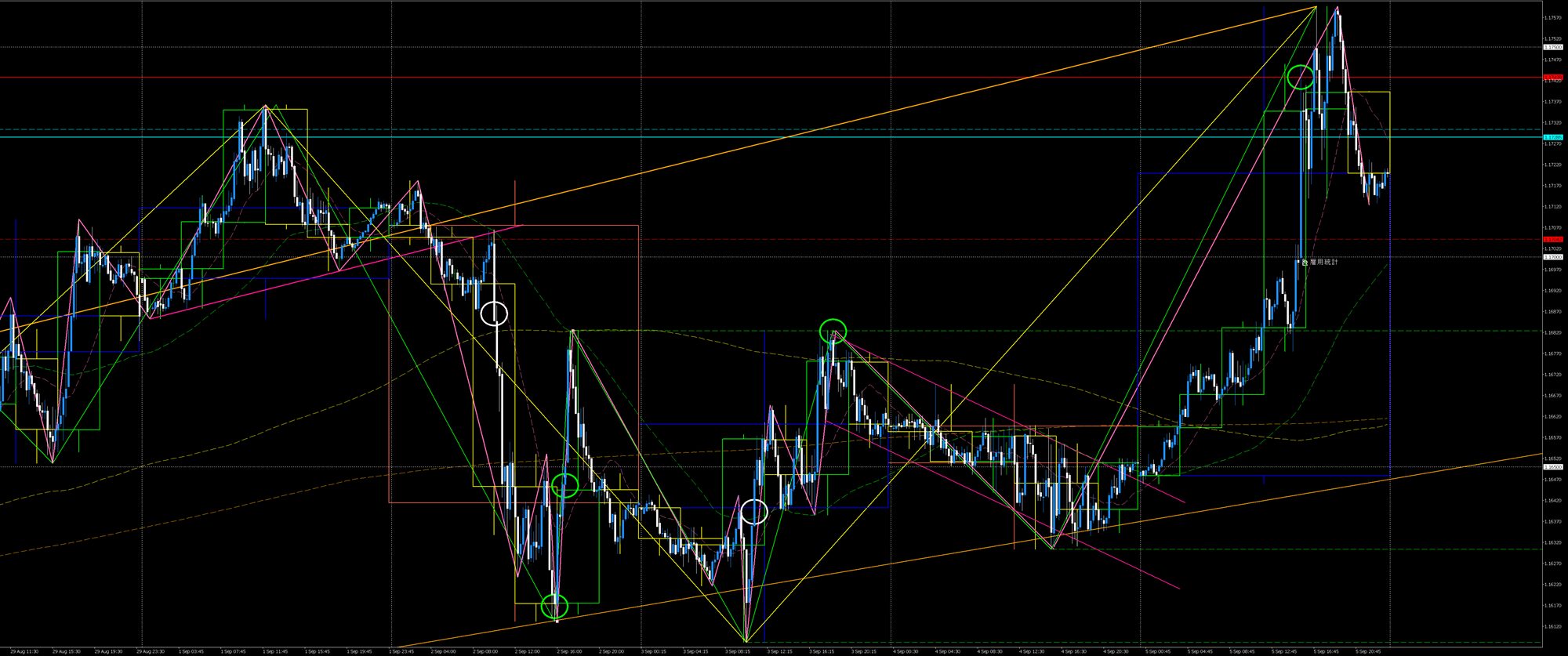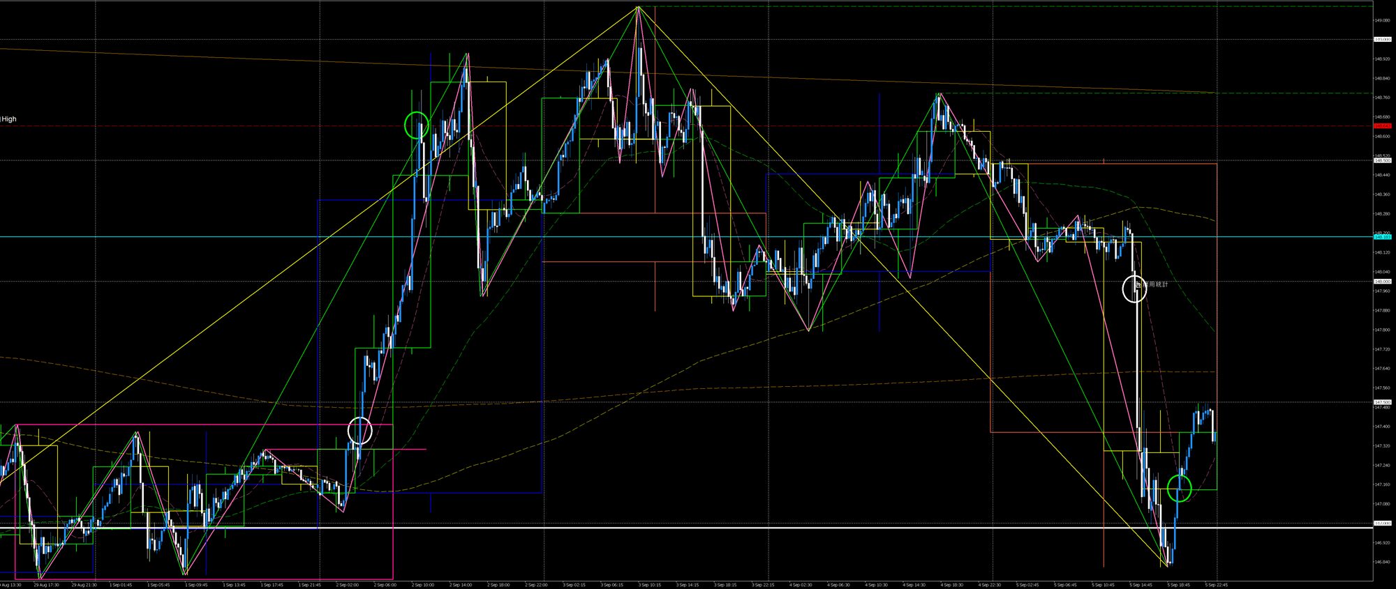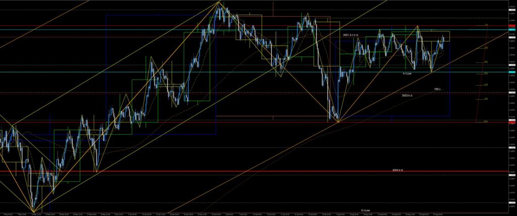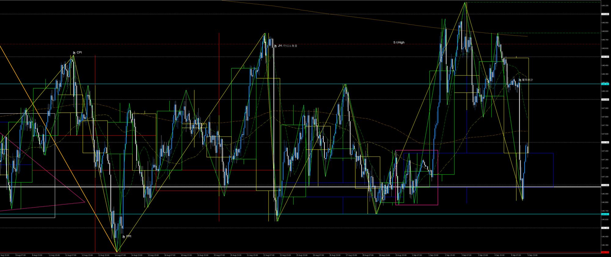 東京時間、8/29高安のハラミ内で15分足安値切上げでロング、欧州時間に先週高値をブレイク、NY時間に5月高値到達で決済。