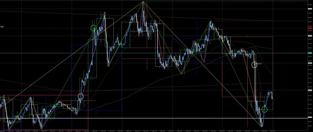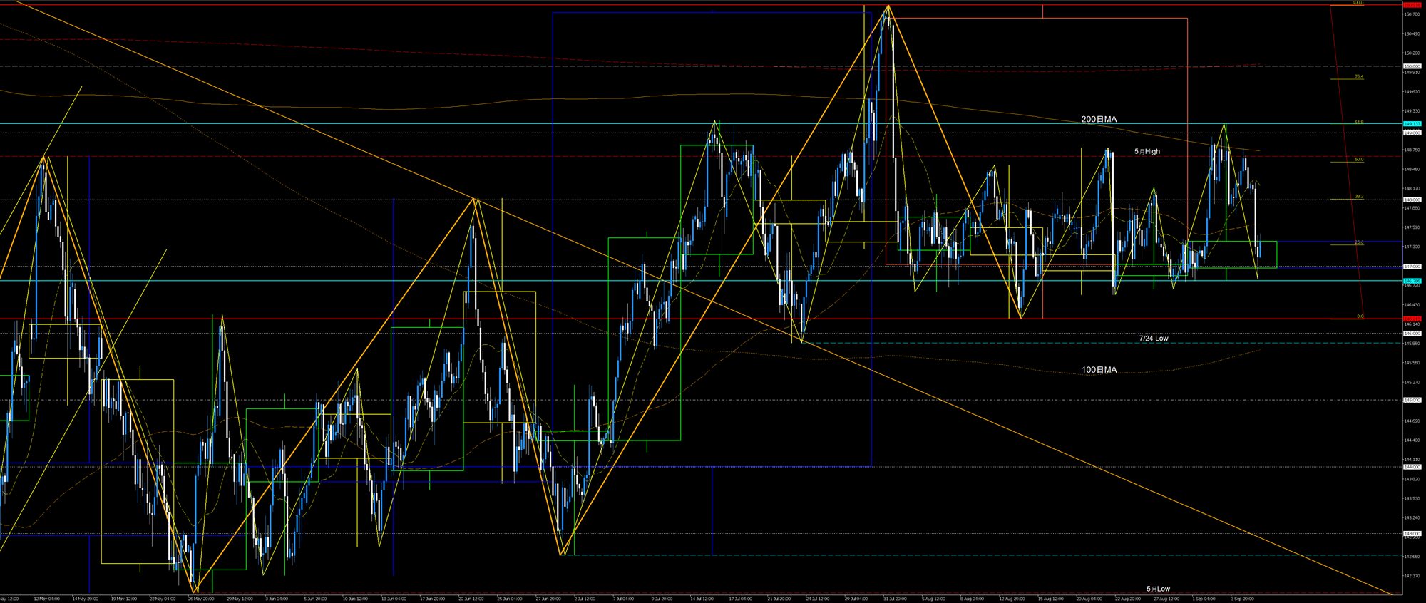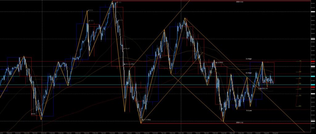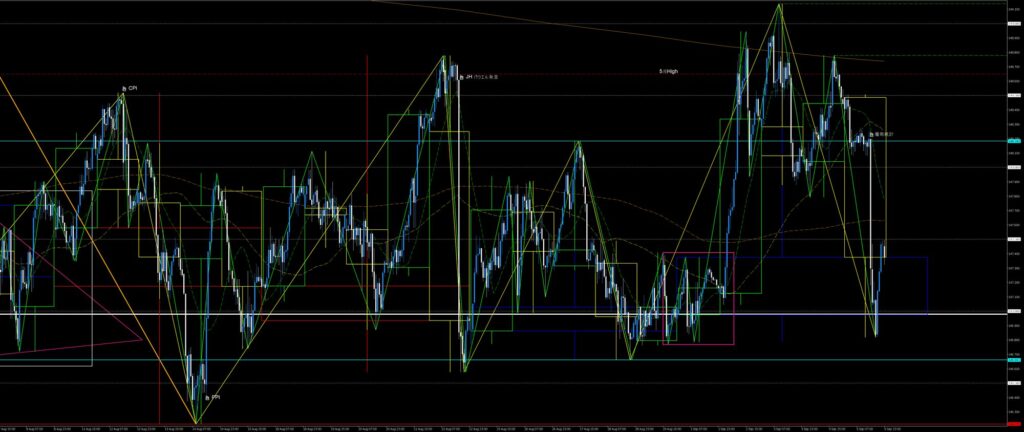 そこで、8月から147円を日足実体で下抜けていないことに着目し、147円を日足実体で割るまでは明確なフォーメーションでも出現しない限り147円付近でのショートは控えました。