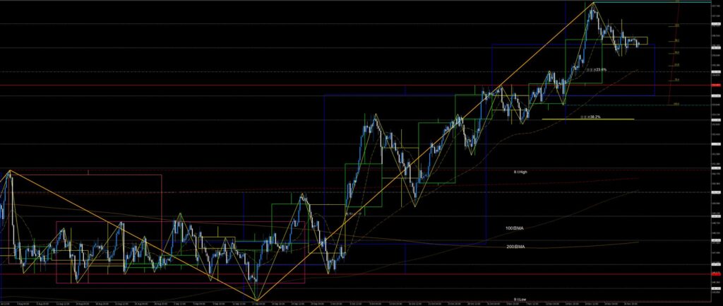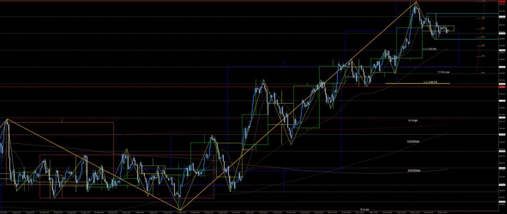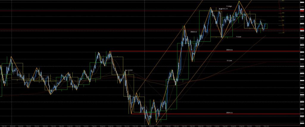 今週は2週前安値2番底から上値を試す展開となりました。感謝祭と重なり伸び悩みましたが、この上昇が日足上昇トレンドの押し目買いへと発展するか、それとも7月高値Wトップ2番天井から7月安値への試しが継続するか今後見極めていきたいと思います。
