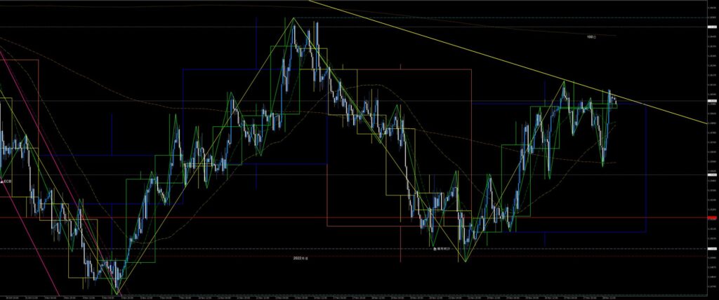 - 1.15を軸に100日MAと200日MAに挟まれ方向感が得られにくい局面