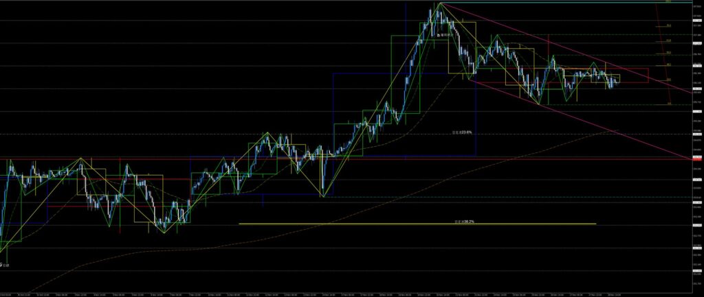 東京・欧州時間、15分足が安値を切上げ上昇したが4h足SMA21を警戒しロングは見送り。NY時間、21日高値で反落。