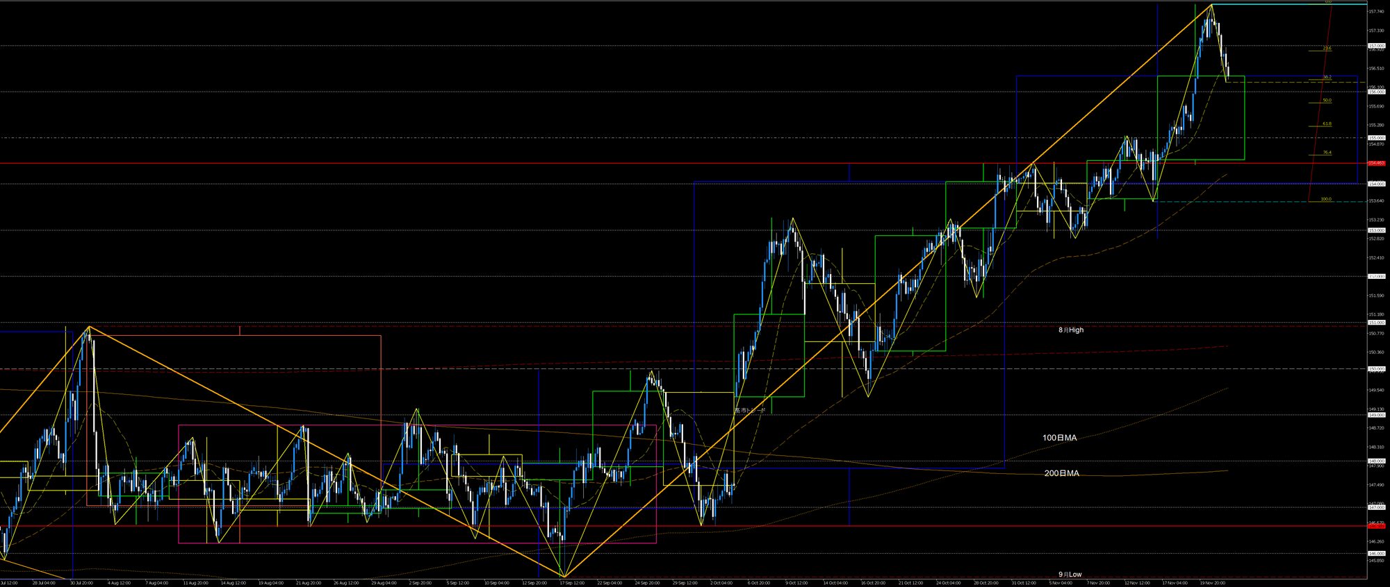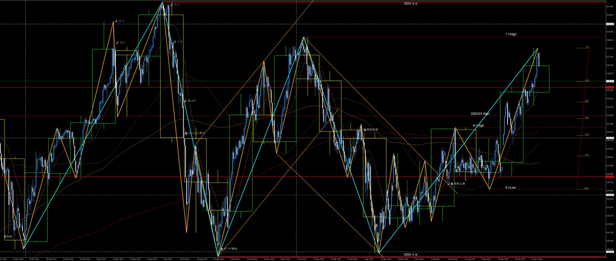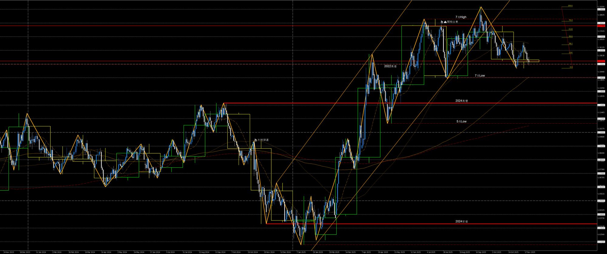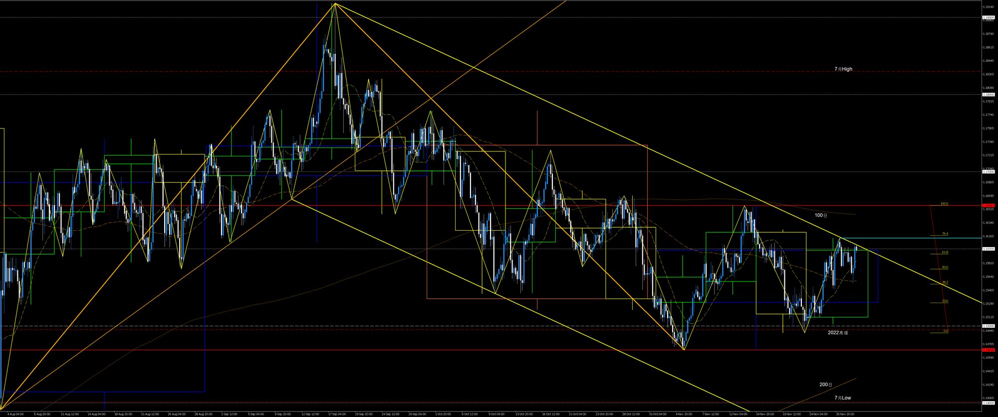 今週は2週前安値2番底から上値を試す展開となりました。感謝祭と重なり伸び悩みましたが、この上昇が日足上昇トレンドの押し目買いへと発展するか、それとも7月高値Wトップ2番天井から7月安値への試しが継続するか今後見極めていきたいと思います。