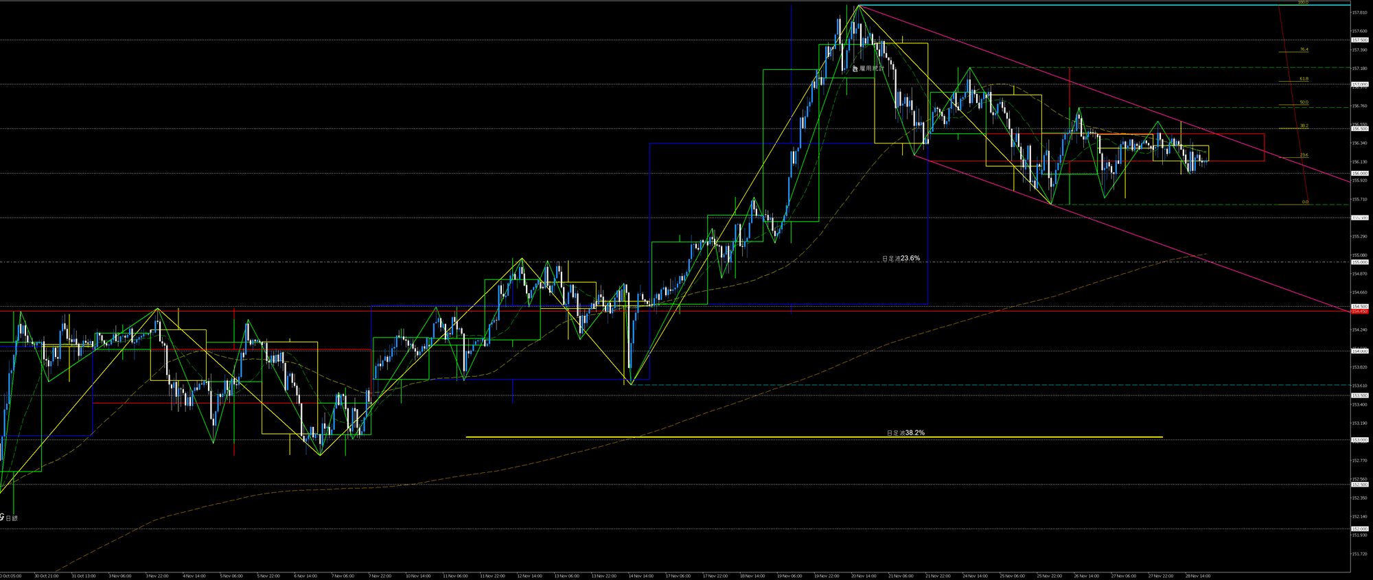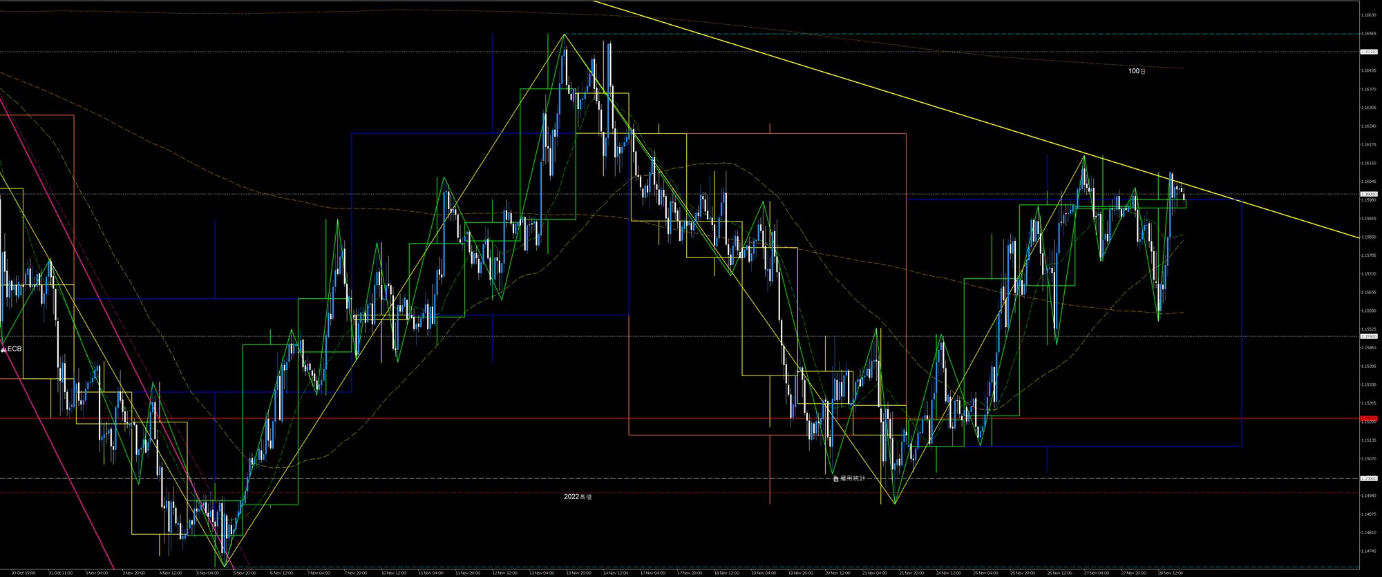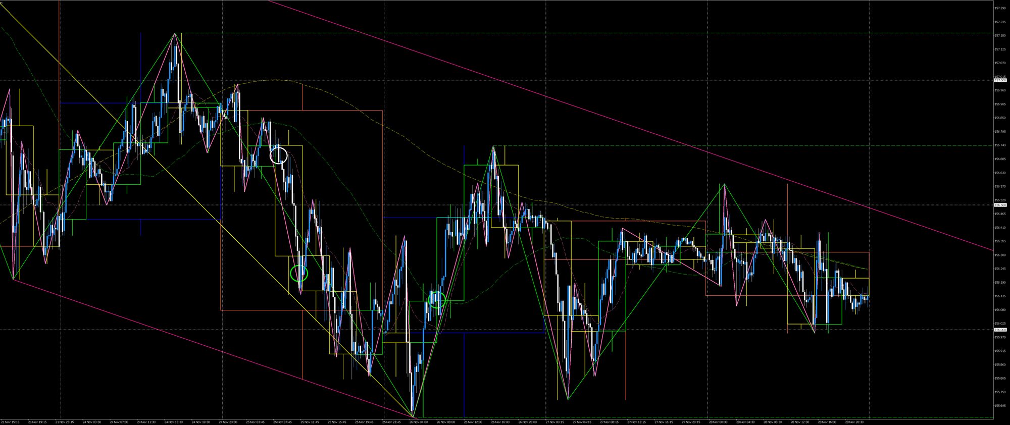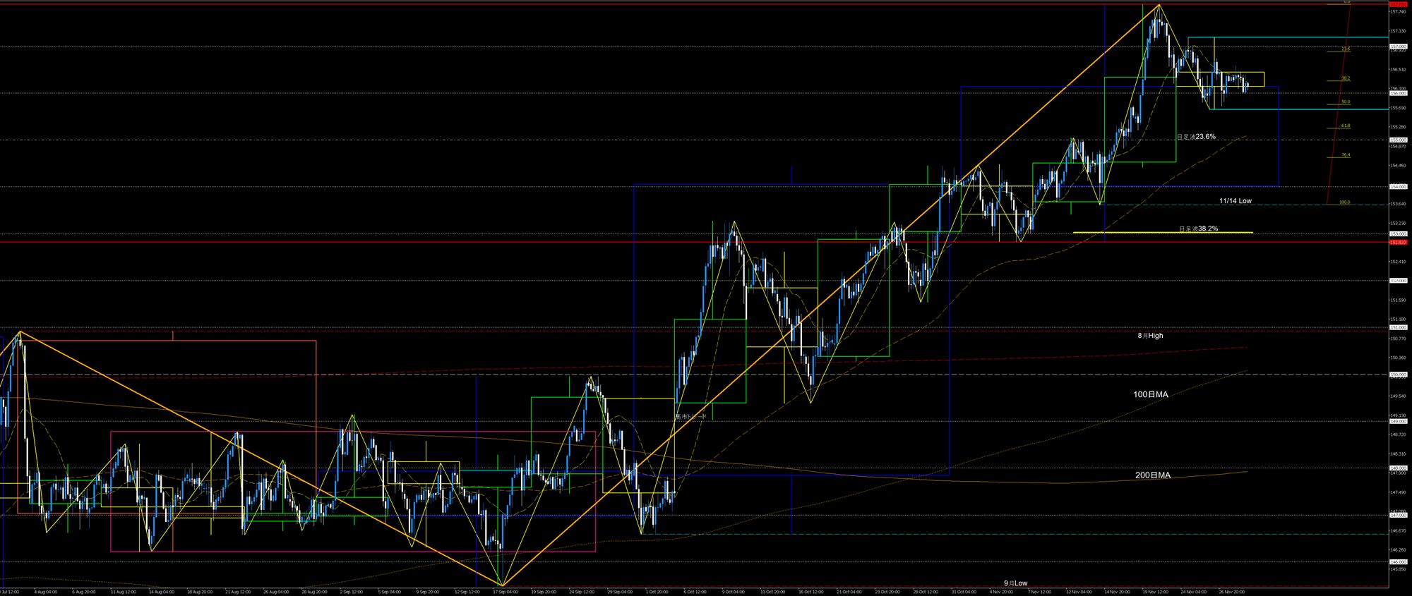 例年、感謝祭は値が動かない傾向にあり、翌日のブラックフライデーとあわせて連休ムードが漂う中では市場参加者も少なく積極性に欠ける相場になりやすいようです。木曜はロングしたくなるところですが、このような状況下では見送ることが賢明だと考えます。