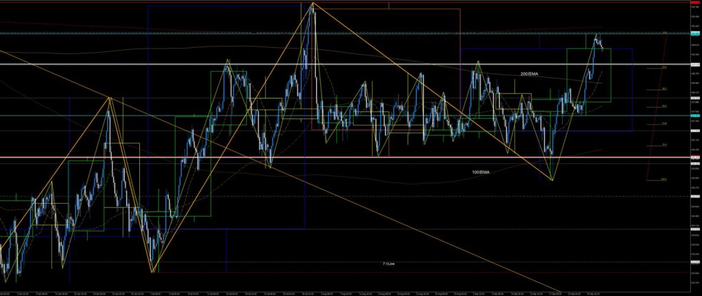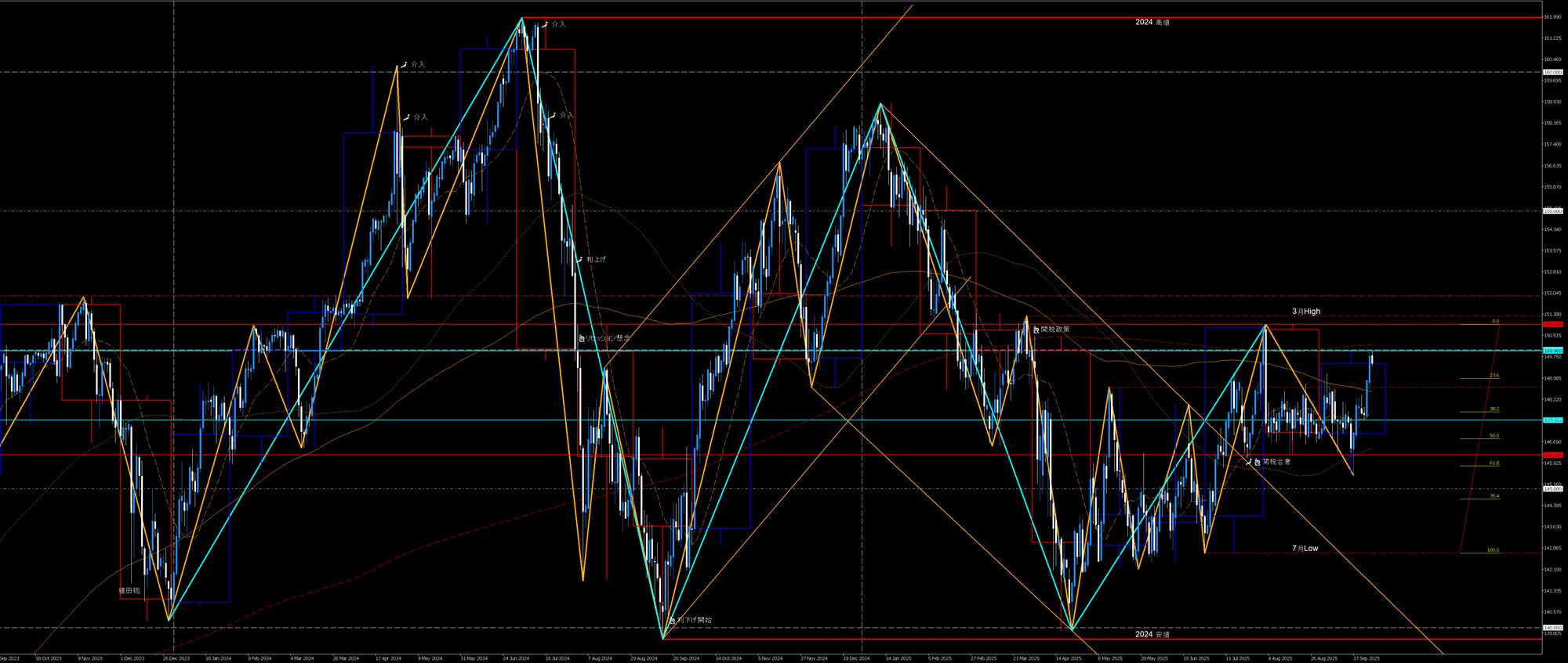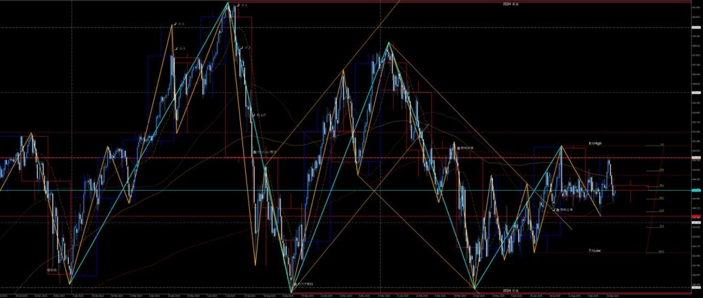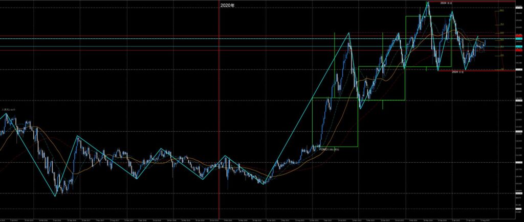 2024高値Wトップ2番天井と2024安値Wボトム2番底との節目150円を挟んだ睨み合い。