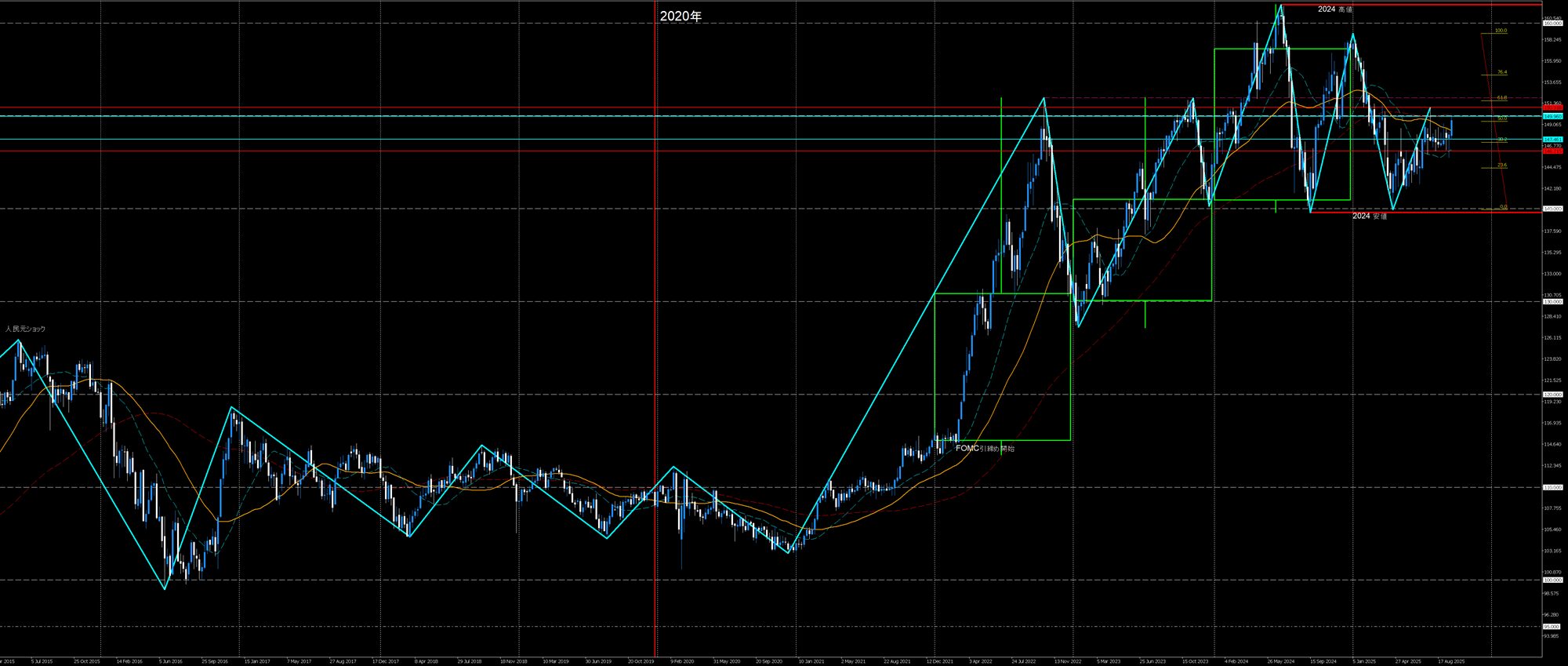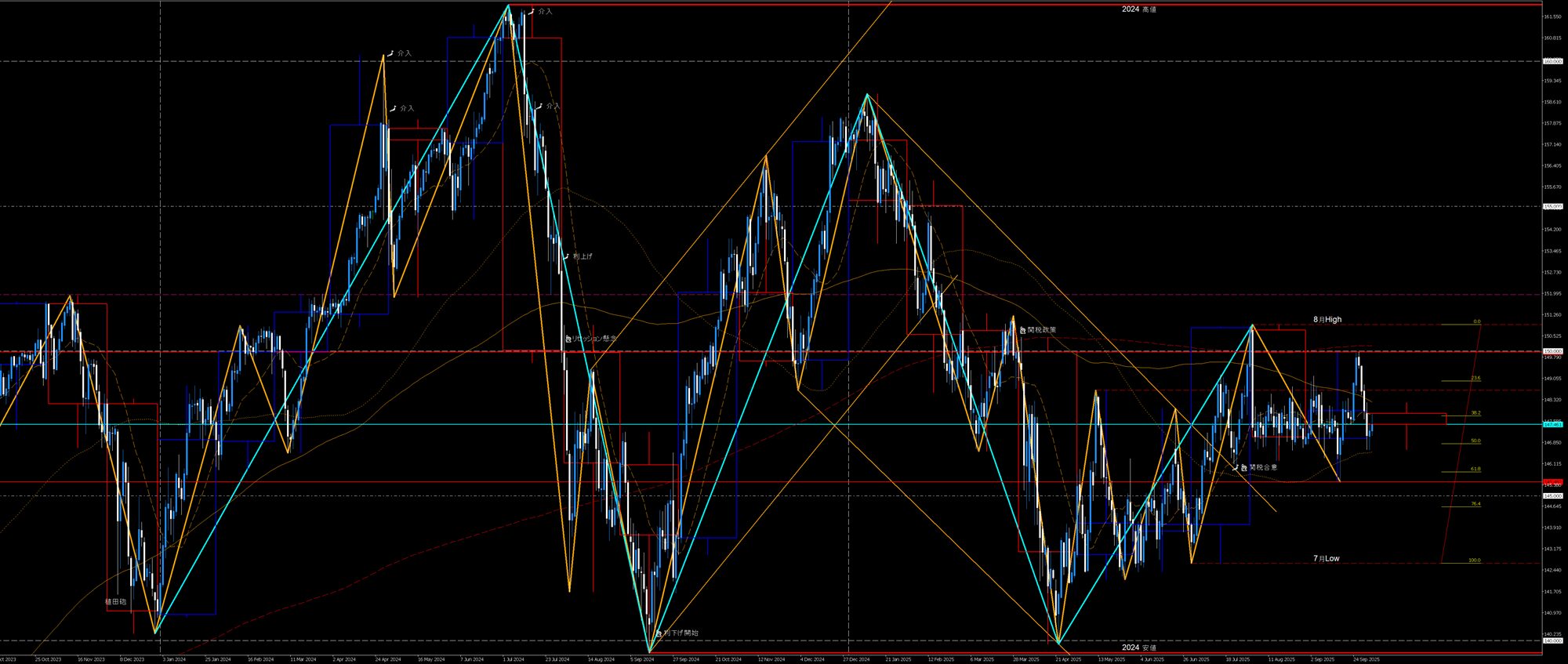 - 2025高値下降波も戻り売り(150円) VS 2025安値上昇波(140円)