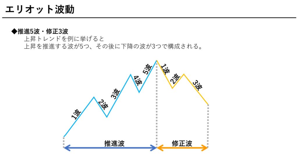 テクニカル分析において有名なエリオット波動によれば、推進派(インパルスムーブ)はトレンドに沿って5つの波で構成されるとあります。