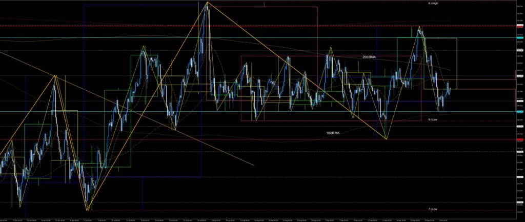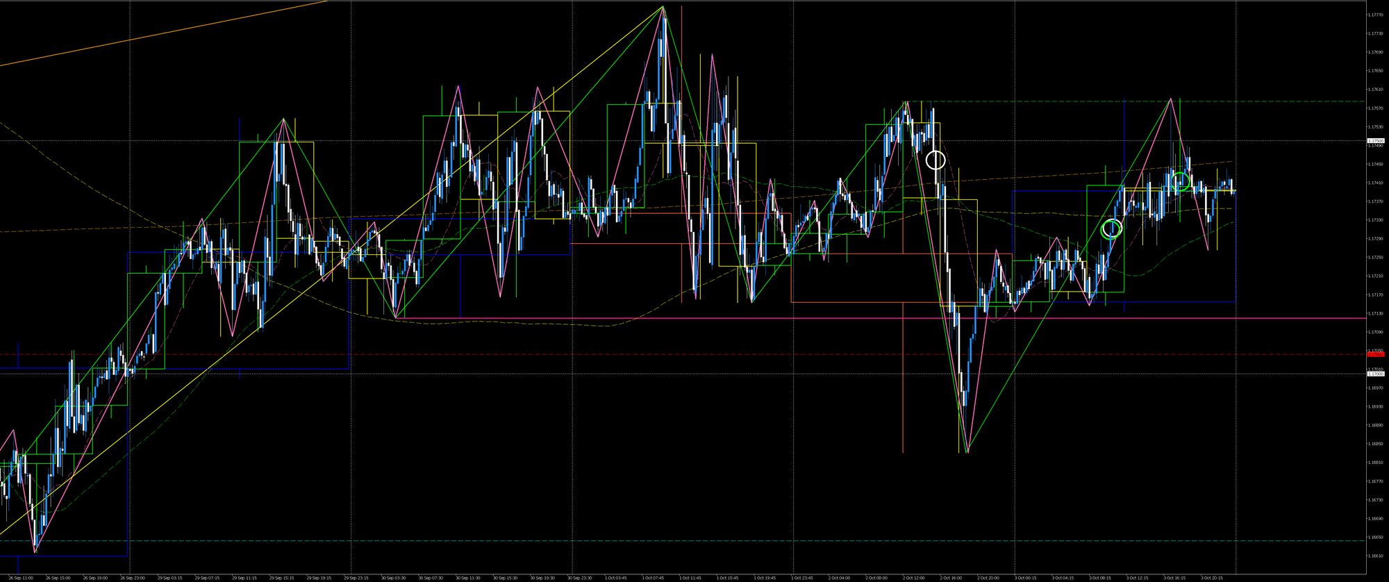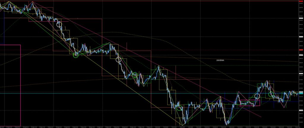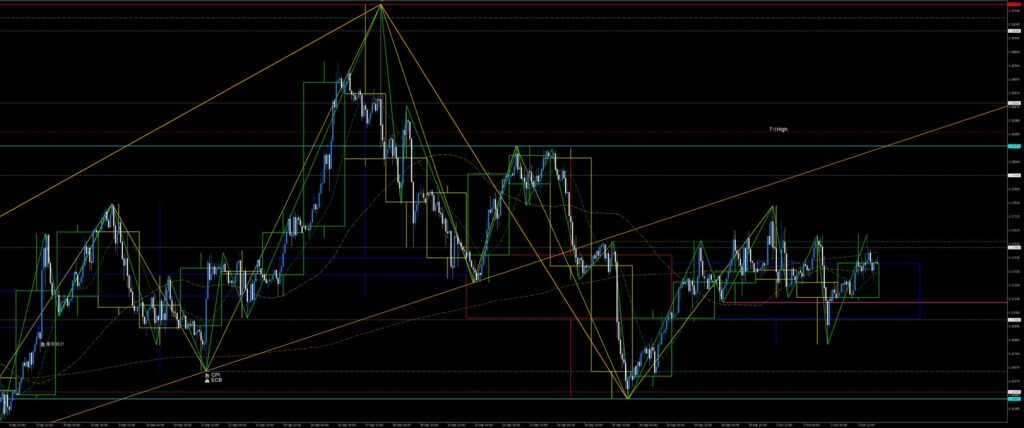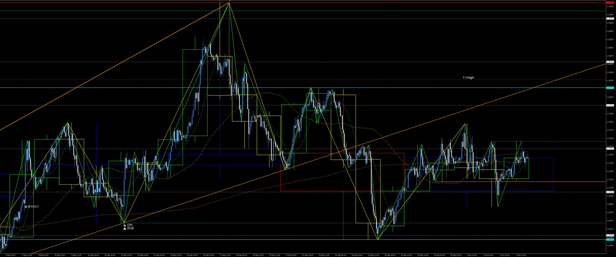 私が駆け出しのころなら、8月から続いたレンジを先週にブレイクしたことで買い目線になっていて月曜と火曜の下落には乗れず、レンジをブレイクした起点の先週安値を水曜に下抜いたことで慌てて下目線に切り替えて木曜は戻り売りしか頭になかったことでしょう。ショートポジションを持ったとしても損切するのが関の山、良くて建値撤退だったと思います。