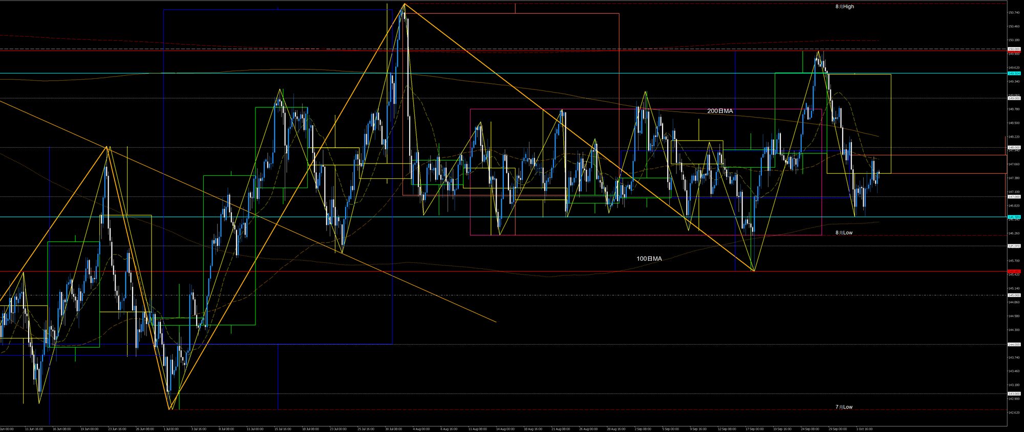 - 100日MAと200日MAに挟まれ2ヵ月弱続いた揉み合いを上抜けて150円に到達