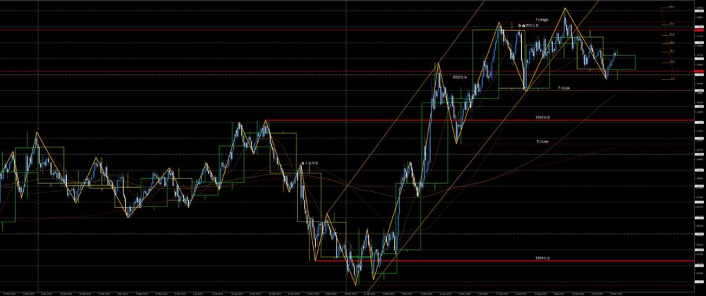 逆三尊の肩ラインである4週前安値へ下落し、2週前安値上昇波の押し目形成モード。