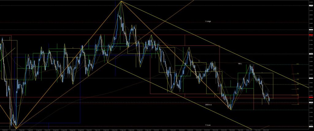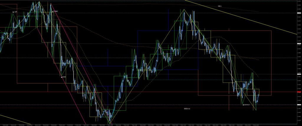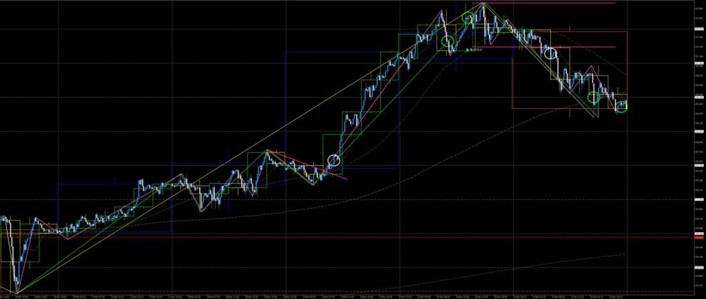 4週前安値を割った水曜の下落は、2週前安値上昇波の押し目買いを狙って買っていたブル派の損切と2週前安値上昇波の中で買っていたブル派の決済がトリガーとなって3週前高値下降波の戻り売りが本格化したもので推進波とみることができます。言い換えれば、押し目崩れや戻り目崩れといったトレードは、この推進波を狙うトレードということになります。