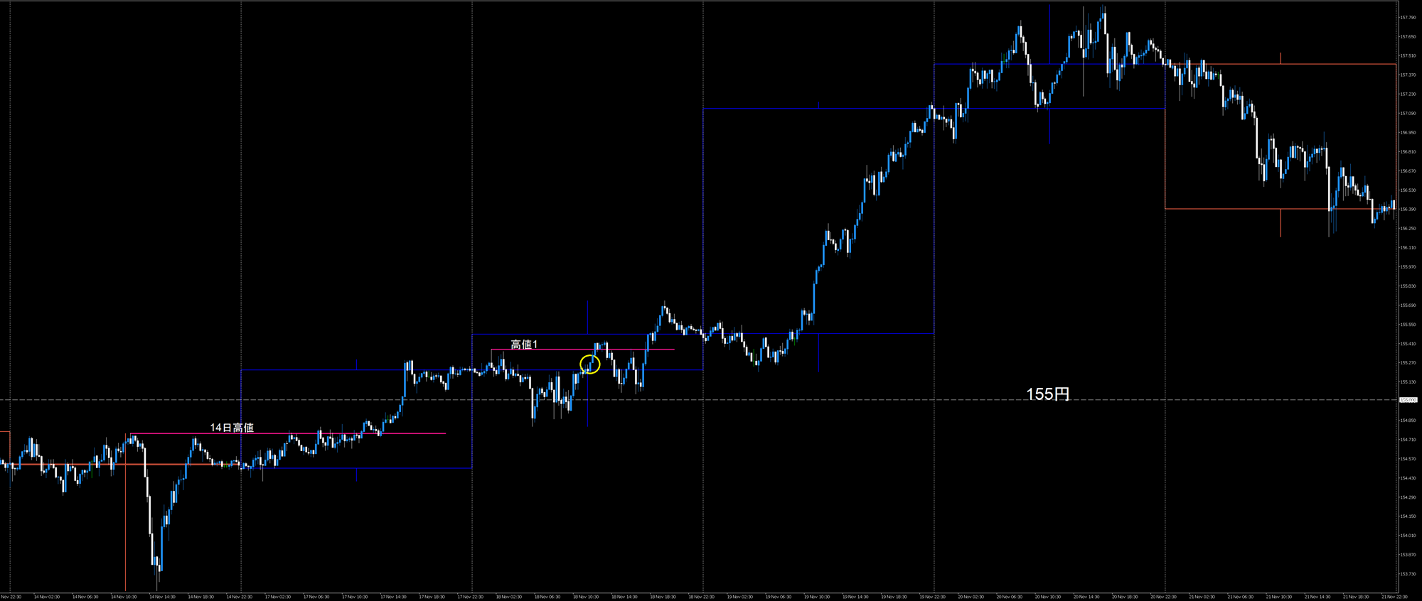 次に『155円抜け確認後』ですが、月曜にブレイクして直ぐに飛び乗るのはリスクしかありません。日足レベルでブレイクして155円のレジサポ転換を確認したいところです。